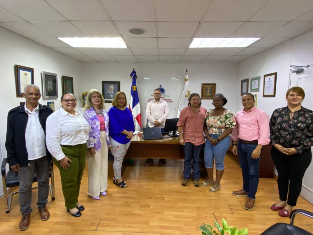 El director del FEDA recibió en su despacho al maestro Bernard Noiret, junto a otros funcionarios de la institución, entre ellos Rafael Pérez Batista, encargado de Operativo; Odelis Soto, de Proyectos Especiales; Rafael Bueno, de Tecnología Agropecuaria; Mary Bautista, del Departamento de Cooperación Internacional, y Solange Vásquez, encargada del Proyecto Consume lo Nuestro.