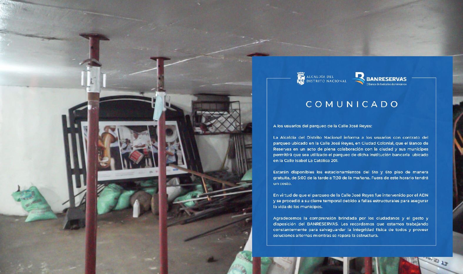 Santo Domingo DN,>La Alcaldía del Distrito Nacional informa a los usuarios con contrato del parqueo ubicado en la Calle José Reyes, en Ciudad Colonial, que el Banco de Reservas en un acto de plena colaboración con la ciudad y sus munícipes permitirá que sea utilizado el parqueo de dicha institución bancaria ubicado en la Calle Isabel La Católica 201.