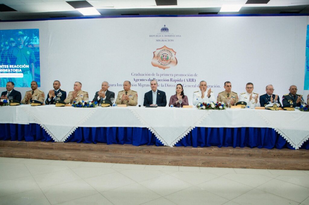 Santo Domingo RD, –El presidente Luis Abinader encabezó la graduación de la primera promoción de 160 agentes de reacción rápida para interdicción migratoria, y entregó 60 camionetas para el fortalecimiento de los operativos de detención y deportación de extranjeros en condición irregular que ejecuta la Dirección General de Migración (DGM) en el territorio nacional.