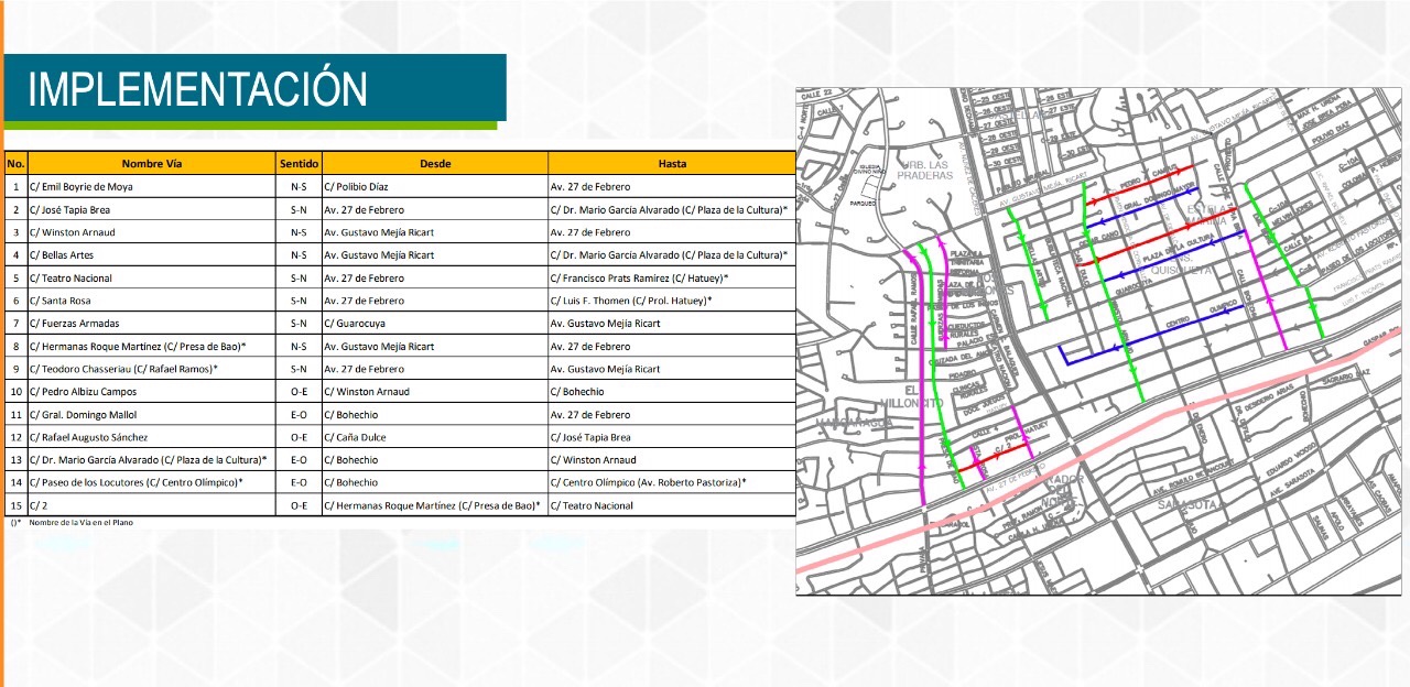 Asimismo, los cambios se extienden a la calle Santa Rosa, Sur-Norte; Calle 2 entre la calle Teatro Nacional y la Hermanas Roque Martínez, Oeste-Este; en la calle Hermanas Roque Martínez, Norte-Sur; calle Fuerzas Armadas, Sur-Norte; calle Theodore Chasseraux, desde la Avenida 27 de Febrero hasta la Avenida Gustavo Mejía Ricard, Sur-Norte, la calle Paseo de los Locutores, entre la calle Bohechio hasta la Avenida Roberto Pastoriza, Este- Oeste.