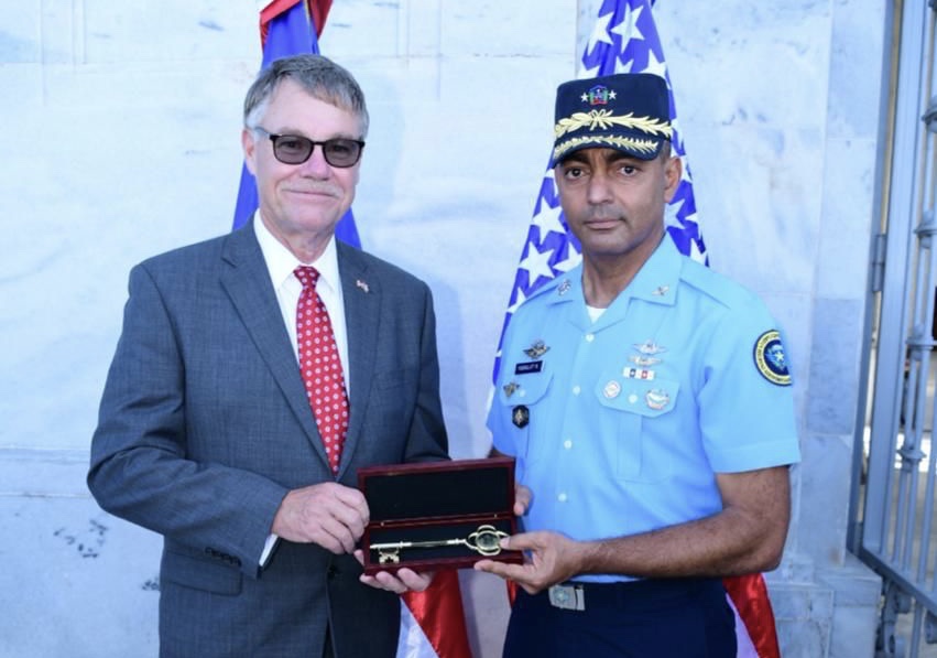 Santo Domingo RD,>El Alcalde de la ciudad de Fort Myes, Kevin Anderson, hizo entrega de la llave de su ciudad al director general del Cuerpo Especializado en Seguridad Aeroportuaria y de la Aviación Civil (CESAC) mayor general Téc. de Av. Carlos Febrillet Rodríguez, FARD, como símbolo de unidad y amistad.