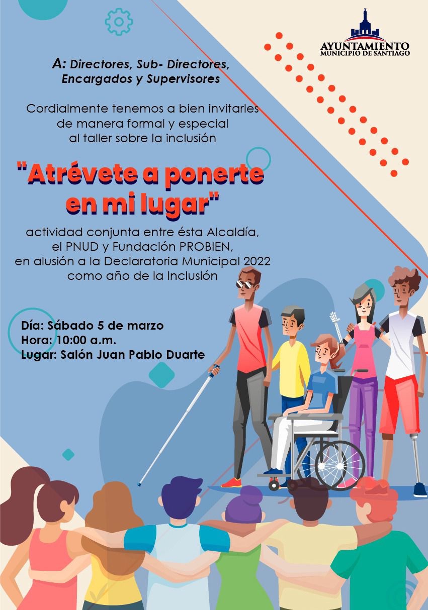 Santiago RD,>La Alcaldía de Santiago, celebrará de manera conjunta con el Programa de las Naciones Unidas para el Desarrollo, (PNUD) y la Fundación PROBIEN, el taller, “Atrévete a ponerte en mi lugar”, actividad que busca hacer de Santiago, una ciudad más justa e inclusiva.