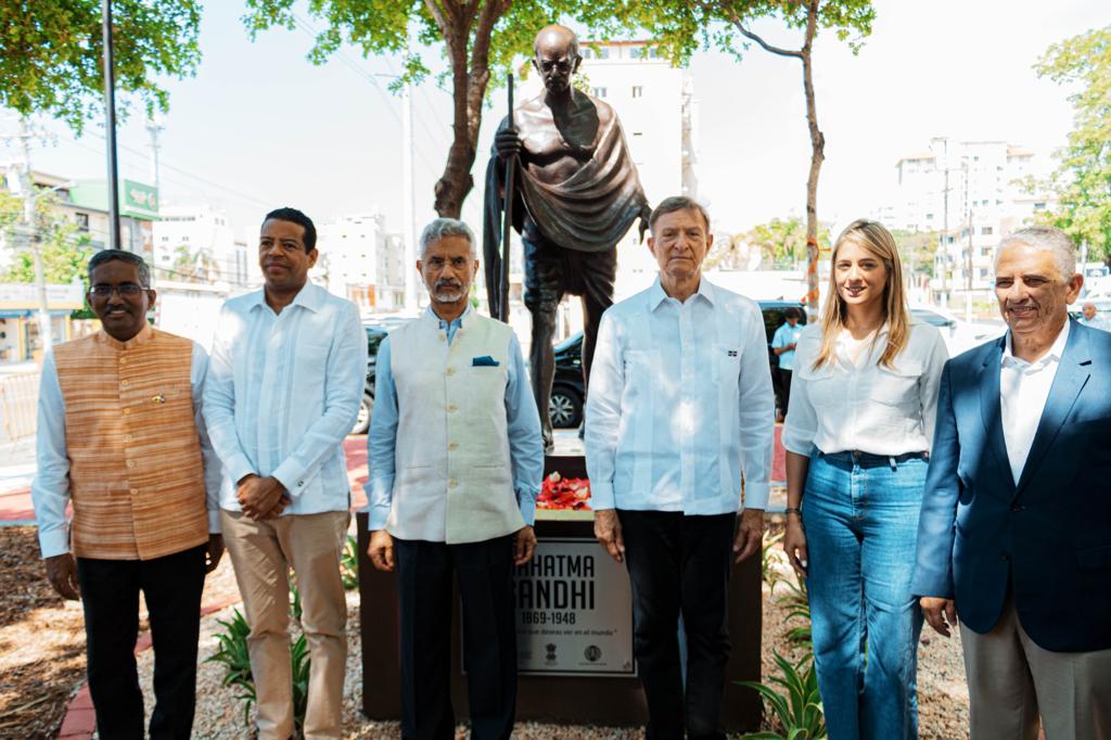 Santo Domingo RD. En un acto encabezado por el ministro de Relaciones Exteriores de la República de la India, excelentísimo. Dr. S. Jaishankar, se llevó a cabo el desvelo de la estatua de Mahatma Gandhi, en la plaza que lleva el mismo nombre, ubicada en el sector de Gascue.
