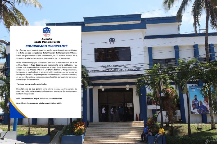 Santo Domingo Oeste. – La Alcaldía de Santo Domingo Oeste informa a todos los ciudadanos y contribuyentes que los pagos correspondientes a arbitrios municipales, así como cualquier gestión relacionada con la Dirección de Planeamiento Urbano, deben realizarse exclusivamente en las oficinas oficiales de la institución, ubicadas en Los Coquitos, Manzana 19, No. 19, sector Las Caobas.