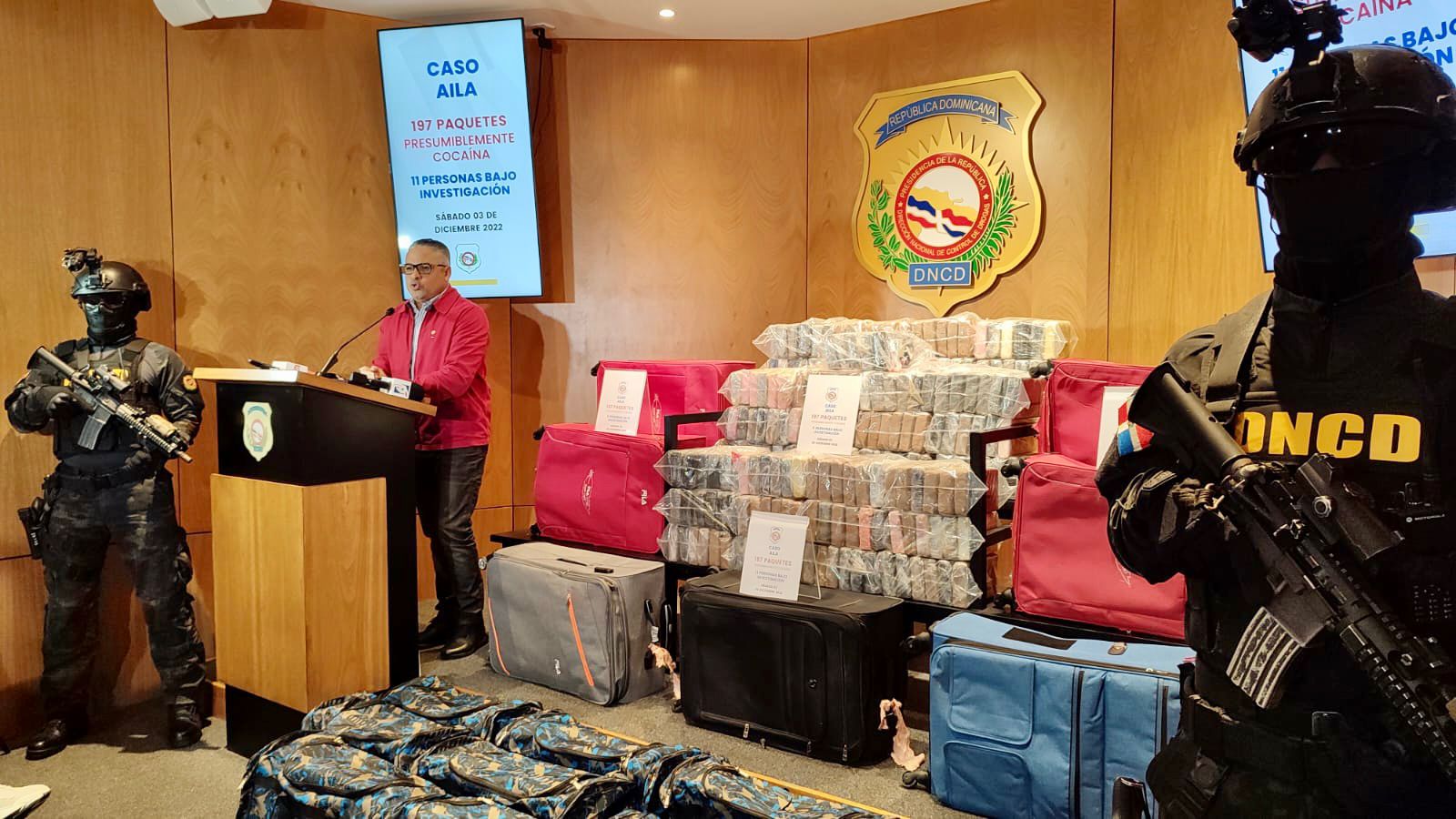Santo Domingo RD,>En el marco de un operativo de seguimiento y vigilancia, la Dirección Nacional de Control de Drogas (DNCD) apoyados por miembros del Cuerpo Especializado de Seguridad Aeroportuaria, agencias de Inteligencia del Estado y bajo la coordinación del Ministerio Público, confiscaron 197 paquetes presumiblemente cocaína en el Aeropuerto Internacional de la Américas, JFPG.