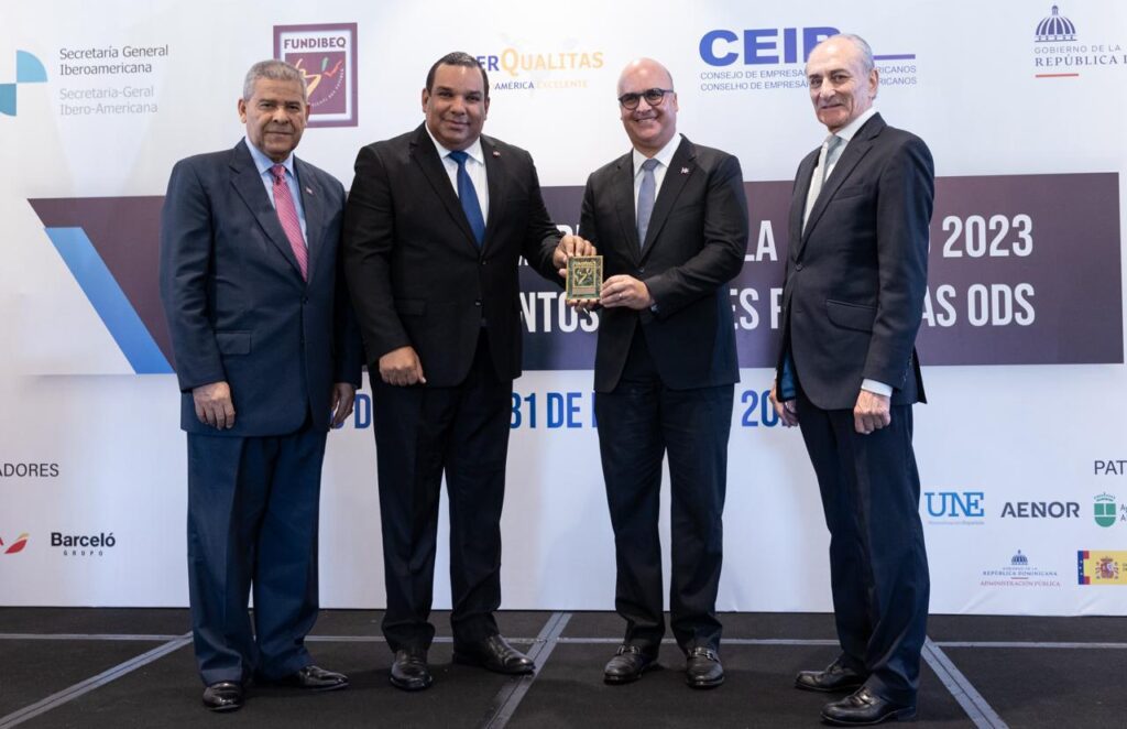 En una ceremonia celebrada en el Hotel El Embajador, el director ejecutivo de la CNE, Edward Veras, recibió la placa de reconocimiento de manos del director general de FUNDIBEQ, Juan Luis Martín Cuesta; Dario Castillo, titular del MAP e Igor Rodríguez, ministro Administrativo de la Presidencia.