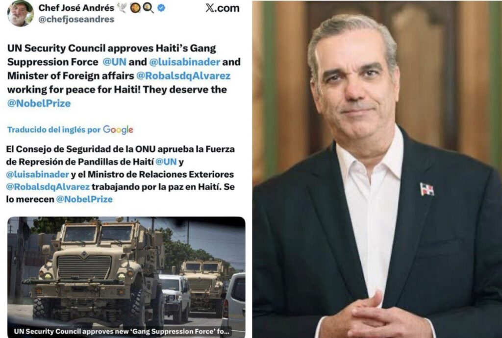 El reconocido chef español, nacionalizado estadounidense, José Andrés, consideró que la buena nueva le merecen al presidente Luis Abinader y al ministro de Relaciones Exteriores, Roberto Álvarez, el Premio Nobel de la Paz, debido a sus constantes iniciativas para llevar estabilidad y paz al pueblo haitiano.
