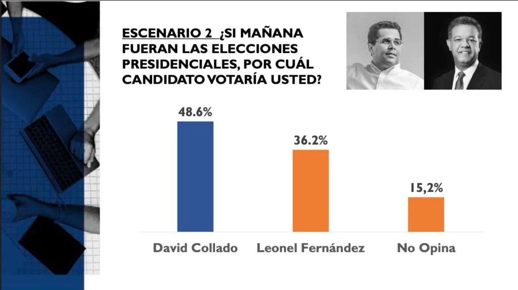 En posibles enfrentamientos directos, David Collado obtendría un 47.8% frente a Omar Fernández quien alcanzaría un 34.0%, mientras subiría a un 48.6% si enfrenta a Leonel Fernández, quien tendría un 36.2%.