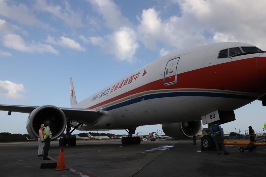 El avión de China Cargo, que arribó al país desde Pekín, a las 5:07 de la tarde, fue recibido por la vicepresidenta de la República, Raquel Peña, en el aeropuerto internacional Las Américas, Dr. José Francisco Peña Gómez.