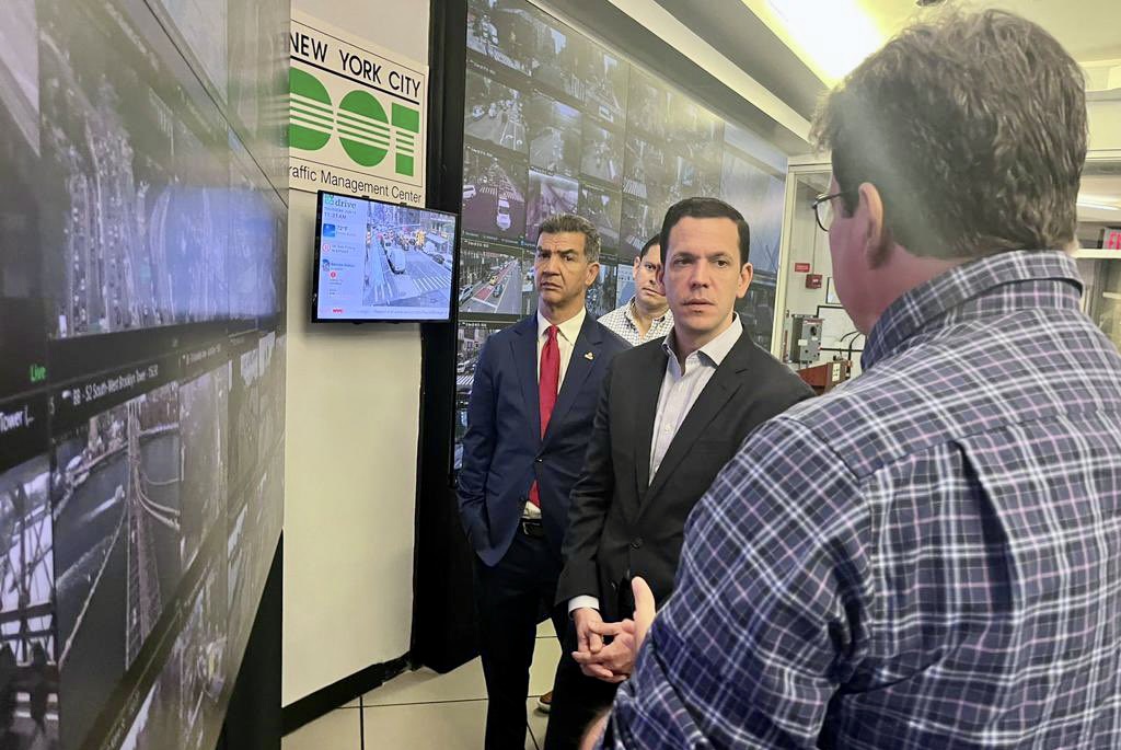 El funcionario fue recibido por el alcalde de la ciudad de New York, Eric Adams, y el comisionado de tránsito, Ydanis Rodríguez, en el Centro de Control de Tráfico de esa ciudad, dando continuidad a los acuerdos de colaboración mutua entre ambas gestiones, con el propósito de apreciar su experiencia en la gestión del tránsito urbano, a propósito de la próxima implementación de un nuevo centro en RD.