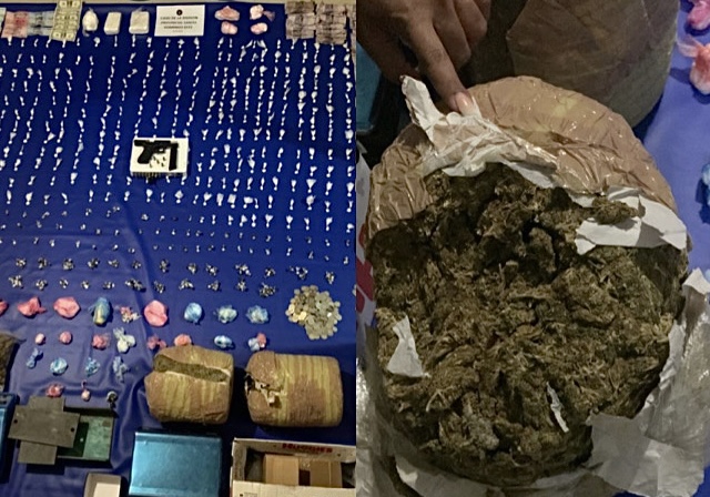 Además, se ocuparon tres vehículos, una pistola, tres armas blancas, seis celulares, cinco balanzas, 25, 105 pesos, ocho dólares, una prensa, tijeras, radios de comunicación, entre otras evidencias.