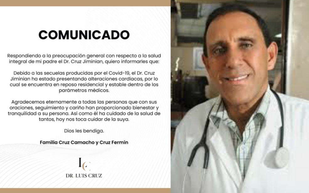 Santo Domingo RD,>El doctor Luis Cruz informó este lunes que su padre, el también doctor Félix Cruz Jiminián, se encuentra en reposo residencial y estable dentro de los parámetros médicos, luego de presentar alteraciones cardíacas producto de secuelas del covid-19.