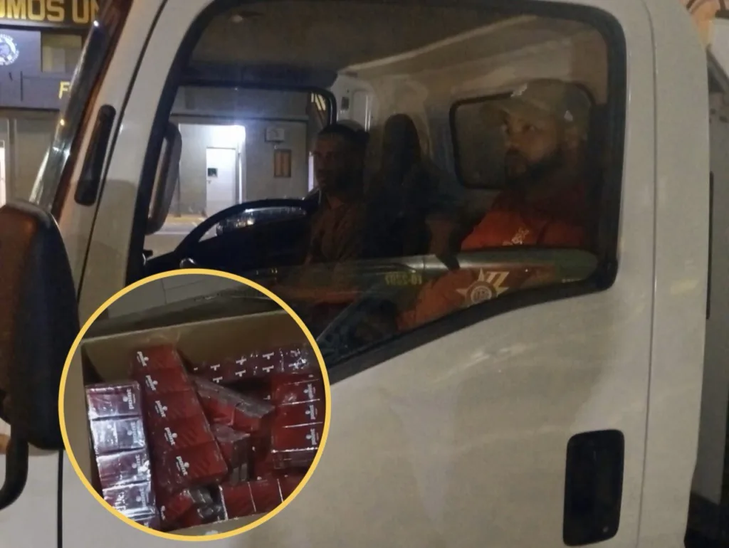 Los detenidos fueron identificados como Francisco Javier de León Labour y Newton Amaury Peña Méndez, quienes se desplazaban a bordo de un camión marca Isuzu, color blanco, placa L392268, en cuyo interior fueron encontrados doscientos cincuenta (250) paquetes de cigarrillos marca Point, ocultos dentro de ocho (08) cajas de cartón de productos comestibles.