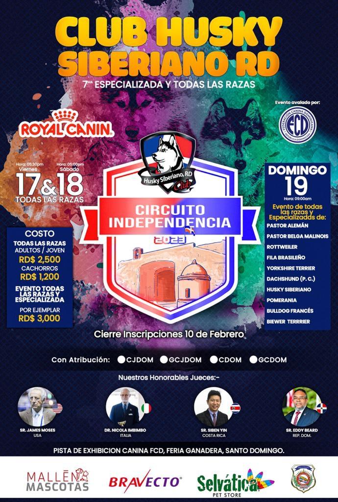 Santo Domingo RD,>El Club Husky Siberiano RD, y Royal Canin, tienen el honor de invitarles a todos los amantes de perros de razas en el pais y al público en general, a participar en el Gran Circuito Canino Independencia 2023, una Exposición Canina Nacional a realizarse los días 17, 18 y 19 de febrero, en la pista de exhibición canina de la Federación Canina Dominicana, en la ciudad Ganadera, Sto.Dgo.