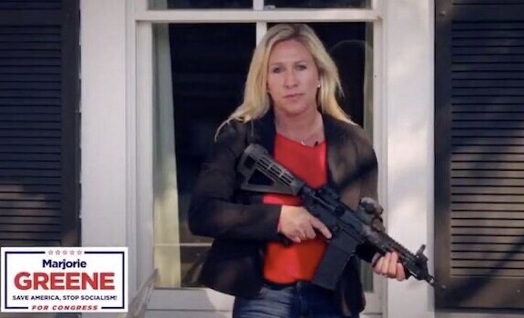Marjorie Taylor Greene ganó en noviembre un escaño en la Cámara de Representantes por Georgia, gracias, en parte, a un anuncio en el que salía armada con un fusil de asalto advirtiendo a los “terroristas de Antifa” de que no pusieran “un maldito pie en el noroeste de Georgia”, y otro en el que salía con el mismo fusil junto a un collage con las fotos de Alexandria Ocasio-Cortez y otras congresistas jóvenes de izquierdas.