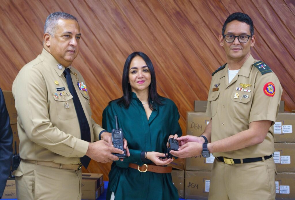 La entrega de los instrumentos fue hecha por la titular del MIP, Faride Raful, y los recibió el vicealmirante Luis Rafael Lee Ballester (ARD), durante un acto en el que también participaron el coronel Randolfo Rijo, director del Sistema Nacional de Emergencias 911, y el sr. Luis García, Comisionado para la reforma policial.