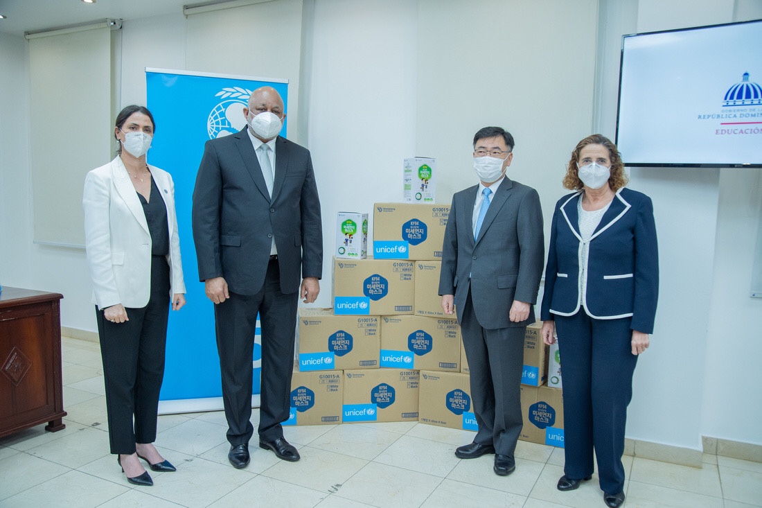 Santo Domingo RD,>La Embajada de la República de Corea en el país y el Fondo de las Naciones Unidas para la Infancia (UNICEF) entregaron al Ministerio de Educación (MINERD) y al Instituto Nacional de Atención Integral a la Primera Infancia (INAIPI) la donación de 500,000 mascarillas, como aporte para el reinicio de la docencia presencial en 48 municipios del país, así como para la reapertura de los servicios de atención a la primera infancia.