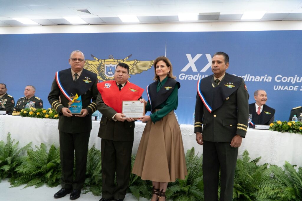 En representación de sus respectivas promociones, líderes académicos y militares recibieron sus títulos, simbolizando el esfuerzo y dedicación de todos los graduandos. Además de los títulos de grado, se reconocieron a los egresados de los programas de educación continua, entre quienes se encuentran 2,650 miembros de las Fuerzas Armadas. También se entregaron certificados a 104 oficiales que completaron la Pasantía Militar Fronteriza, fortaleciendo las capacidades operacionales en la frontera.