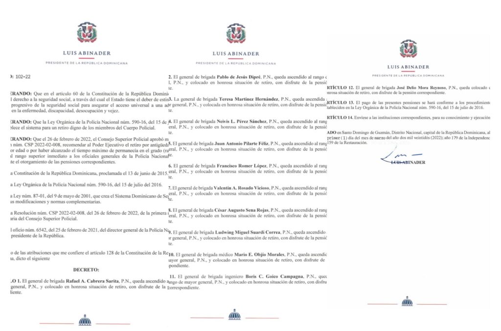 Mediante esa disposición, el general de brigada Pablo de Jesús Dipré, P.N., queda ascendido al rango de mayor general, P.N., y colocado en honrosa situación de retiro, con disfrute de la pensión correspondiente, al igual que la general de brigada Teresa Martínez Hernández, P.N.; el general de brigada Neivis L. Pérez Sánchez, P.N.; el general de brigada Juan Antonio Pilarte Féliz, P.N.; el general de brigada Francisco Romer López, P.N.