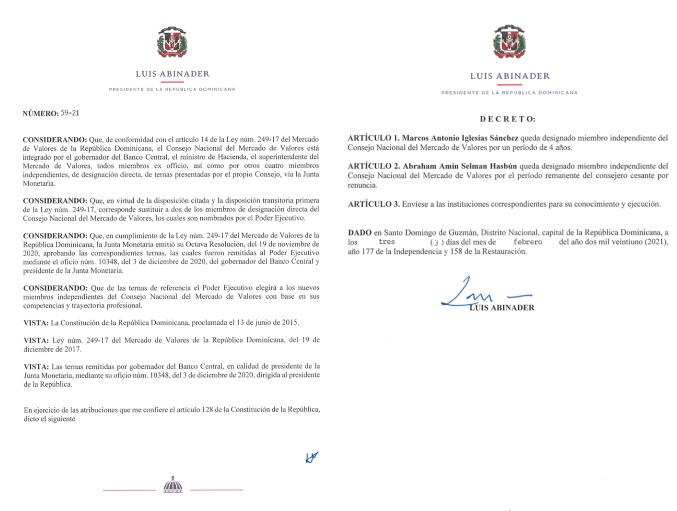 Santo Domingo RD,>El presidente Luis Abinader nombró este miércoles mediante el Decreto 59-21 a dos miembros del Consejo Nacional del Mercado de Valores.