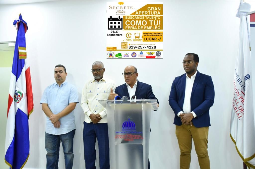 Santo Domingo RD,>La Comisión Presidencial de Apoyo al Desarrollo Barrial (CPADB), junto al Ministerio de Trabajo anunció la celebración de la Gran Feria de Empleos a efectuarse los días 26 y 27 del presente mes, donde el Grupo Martinón, dispondrá la oferta de empleo para ocupar cerca de 3,000 vacantes en el nuevo hotel Secret Tides, en la zona de Uvero Alto, provincia la Altagracia.