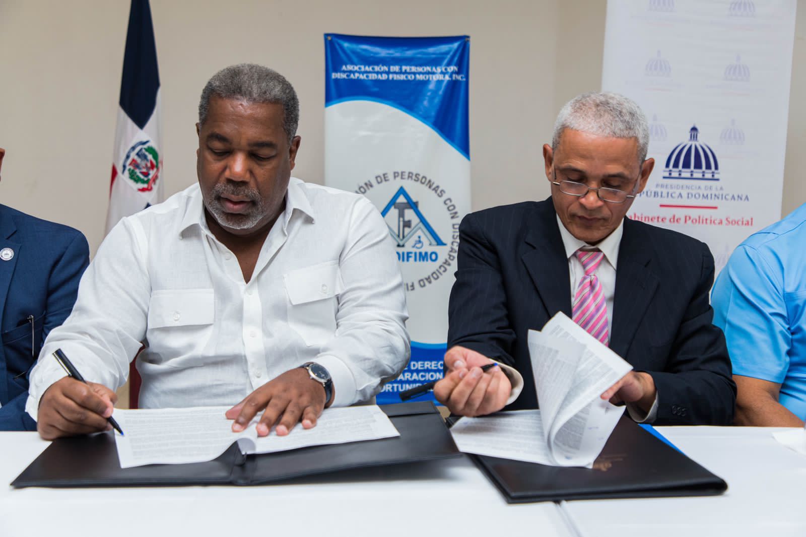 Santo Domingo, D.N.>El coordinador del Gabinete de Política Social, Tony Peña y el coordinador de la Asociación de Personas con Discapacidad Físico-motora, Modesto Elías Parra Rodríguez, firmaron este jueves un acuerdo interinstitucional en el que se comprometieron a dar participación activa a los miembros de este sector poblacional en todos los programas de protección social, ejecutados por el Gabinete.