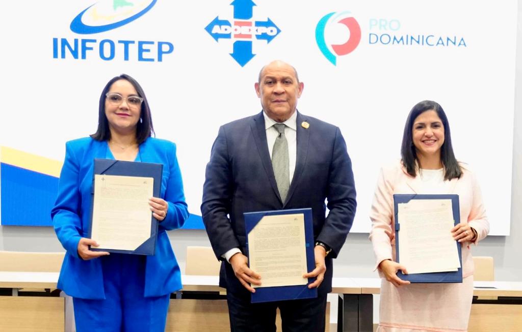 Los acuerdos fueron firmados por Rafael Santos Badía, director general del INFOTEP; Biviana Riveiro, directora de PRODOMINICANA, y Elizabeth Mena, presidenta de la Junta Directiva de ADOEXPO.