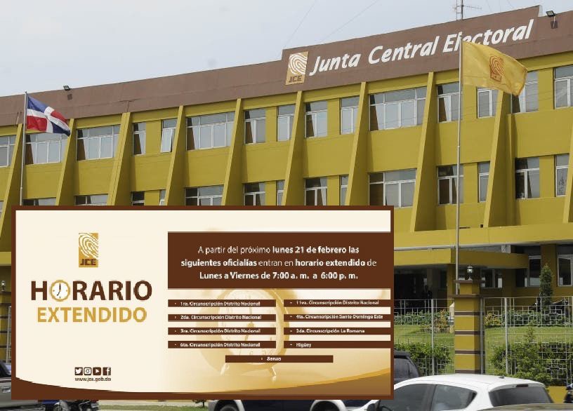 Santo Domingo RD,>La Junta Central Electoral informó que nueve oficialías laborarán en horario extendido a partir de este lunes 21 de febrero, con la finalidad de que los ciudadanos tengan más espacio de tiempo para realizar sus gestiones.