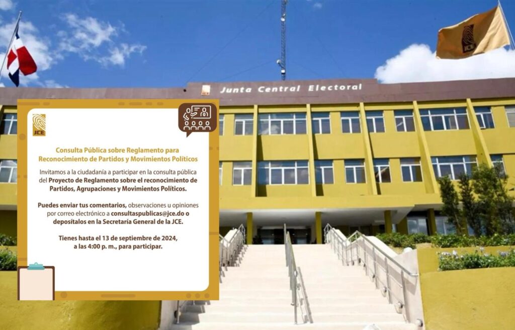 Santo Domingo RD,>La Junta Central Electoral (JCE) convoca a toda la ciudadanía a participar en la consulta pública del Proyecto de Reglamento sobre el reconocimiento de Partidos, Agrupaciones y Movimientos Políticos. Este proceso es una oportunidad valiosa para que los ciudadanos expresen sus opiniones, comentarios y sugerencias, asegurando que el reglamento final sea inclusivo y represente las necesidades y expectativas de la sociedad.