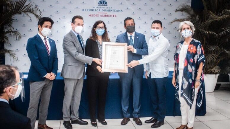 El pergamino fue entregado por el ministro de Medio Ambiente, Orlando Jorge Mera y otras personalidades, a la viceministra de Innovación, Transparencia y Atención Ciudadana del MAPRE, Dilia Leticia Jorge Mera y al director de Ingeniería y Servicios Generales del Palacio Nacional, Joel Nazario; al acto llevado a cabo en la sede del ministerio ambiental también asistió Marcos Méndez, Analista en Prevención y Seguridad Laboral.