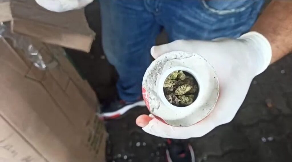 Por instrucciones del fiscal, se procedió a abrir la caja, encontrando camuflados en prendas de vestir y varios productos, siete latas que simulaban ser de refrescos, llenas de marihuana, con peso aproximado de dos libras.