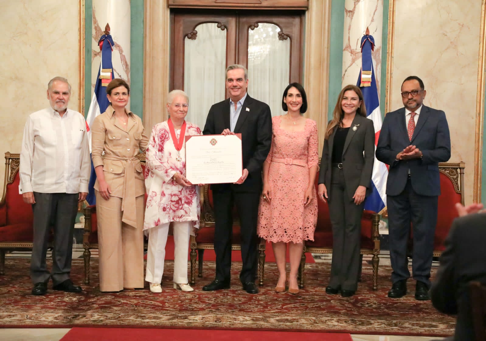 Santo Domingo RD,>El presidente Luis Abinader junto a la vicepresidenta Raquel Peña, concedió mediante el decreto 128-23 la Orden Heráldica de Cristóbal Colón en el Grado de Comendador a la señora Rosa Margarita Bonetti de Santana, mejor conocida como Pirigua, por su respaldo, contribución e iniciativas innovadoras a favor de la preservación del medio ambiente.