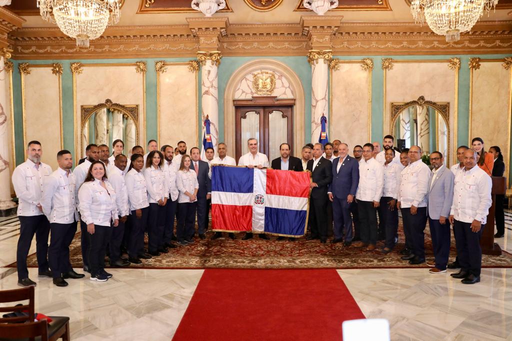 Santo Domingo RD,>El presidente Luis Abinader entregó este martes la bandera nacional a la delegación dominicana que participarán en los XXlV juegos Centroamericanos y del Caribe, San Salvador 2023, a celebrarse del 23 de junio al 8 de julio en San Salvador y que tendrá como subsede a República Dominicana.
