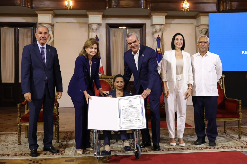 El mandatario junto a la vicepresidenta Raquel Peña; la primera dama Raquel Arbaje y los ministros de Educación, Ángel Hernández y de Educación Superior, Ciencia y Tecnología, Franklin García Fermín, también reconoció a 10 docentes en el ámbito de la Educación Superior, en el Salón Las Cariátides del Palacio Nacional.