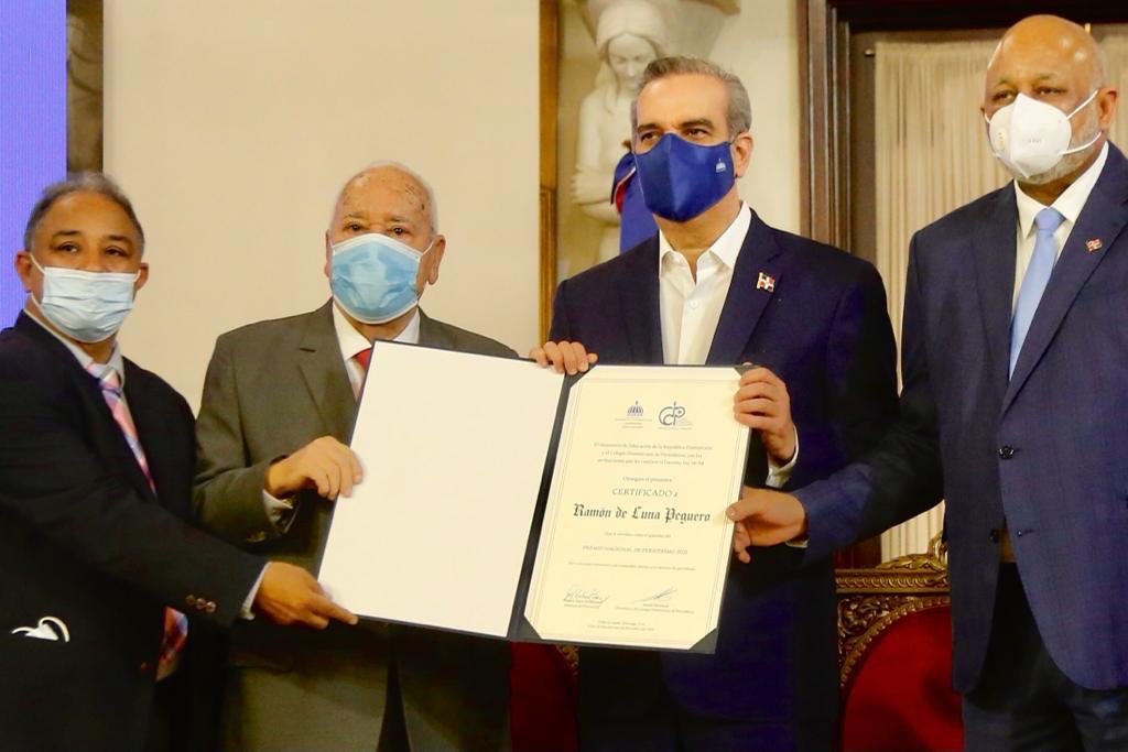 Santo Domingo RD,>El presidente Luis Abinader entregó este lunes el Premio Nacional de Periodismo 2021 al periodista y locutor Ramón de Luna Peguero, de Santiago, en reconocimiento a su intachable trayectoria profesional de más de 73 años.