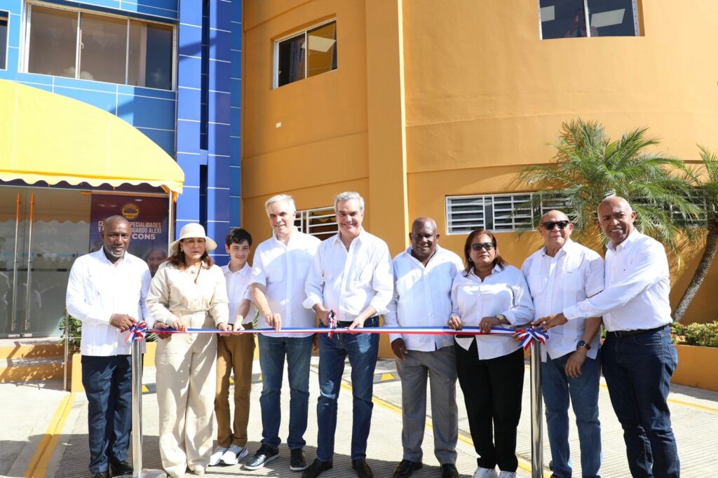 El presidente Luis Abinader, en compañía del Ministro de Trabajo, Luis Miguel De Camps, el diputado Pedro Julio Alcántara, el director del Fopetcons, Faustino de los Santos y funcionarios del Municipio Santo Domingo Este, hizo el corte de cinta para dejar formalmente inaugurado el nuevo y único Centro de Especialidades y Geriatría que a partir de ahora funcionara en esa demarcación.