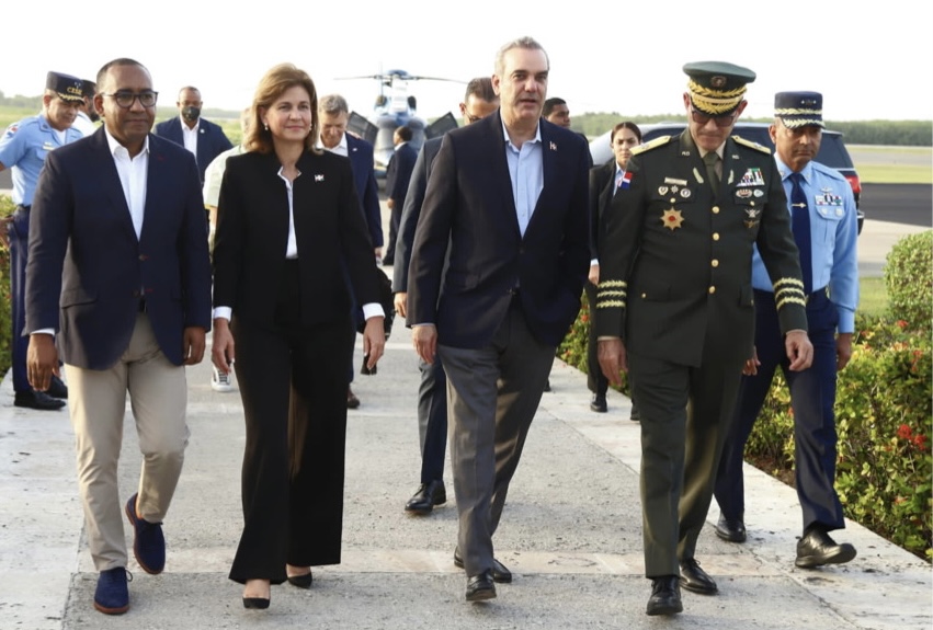La comitiva que lo acompaña la integran el ministro de Relaciones Exteriores, Roberto Álvarez; su asistente personal, Mercedes Pichardo; Eilyn Beltran, secretario general de Gabinete del Palacio Nacional, y el general Jimmy Arias Grullón, subjefe del Cuerpo de Seguridad Presidencial.