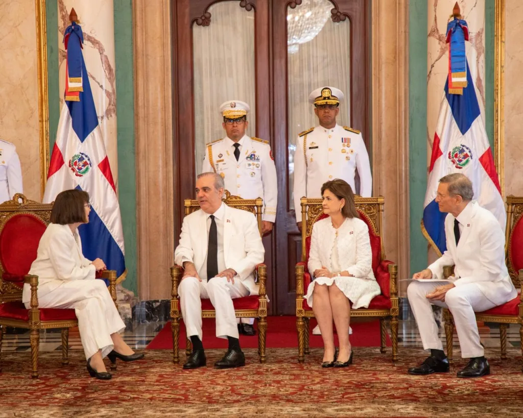 Santo Domingo RD, -El presidente Luis Abinader, junto con la vicepresidenta Raquel Peña y el ministro de Relaciones Exteriores, Roberto Álvarez, recibió este miércoles las cartas credenciales de seis nuevos embajadores acreditados en la República Dominicana, quienes asumen sus funciones con una amplia trayectoria en el servicio exterior y en diversos ámbitos de la cooperación internacional.