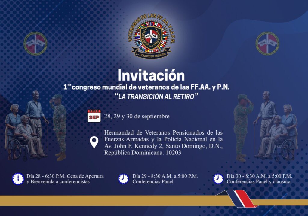 La Hermandad de Veteranos Pensionados de las Fuerzas Armadas y la Policía Nacional de la República Dominicana celebrará del 28 al 30 de septiembre de 2025, el Primer Congreso Mundial de Veteranos Pensionados, bajo el lema “La Transición al Retiro”. Esta iniciativa histórica busca congregar a representantes nacionales e internacionales para debatir, compartir experiencias e impulsar nuevas políticas en beneficio de los veteranos.