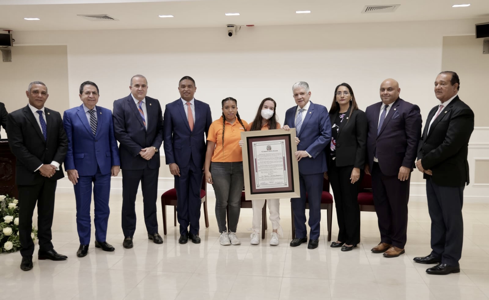 Para la entrega del pergamino de reconocimiento a la Fundación Jompéame, Eduardo Estrella se hizo acompañar de los senadores Lía Díaz Santana, Aris Yván Lorenzo, Antonio Marte, Milcíades Franjul, Franklin Romero, Lenin Valdez y Alexis Victoria.