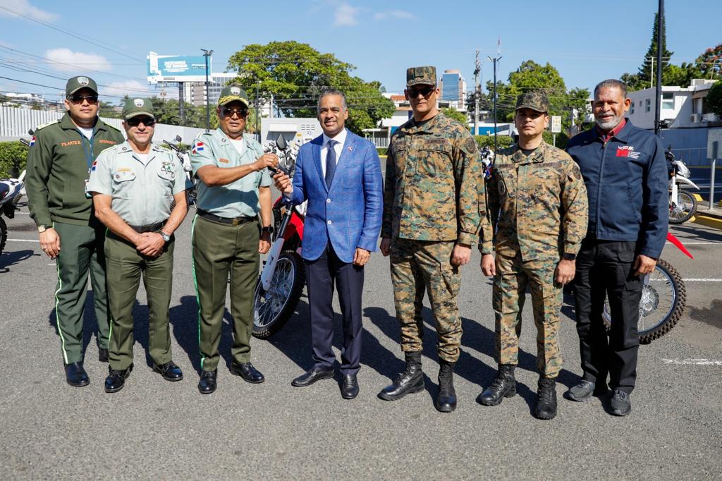 El ministro de la Presidencia, Joel Santos Echavarría, acompañado del director ejecutivo del Sistema 9-1-1, coronel piloto, Randolfo Rijo Gómez, ERD, realizó la entrega formal de las motocicletas al general de brigada, Ramón Antonio Guzmán, P.N., director de la DIGESETT, con el propósito de fortalecer el parque vehicular para la mejora en la atención a las emergencias de tránsito.