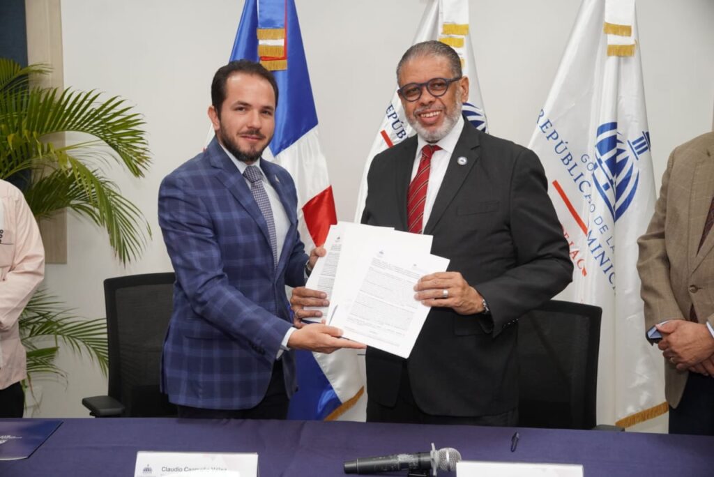 El convenio fue suscrito por Claudio Caamaño Vélez, director de la TNR, y Modesto Guzmán, titular de la DGDC, en un acto realizado en el Salón Gilberto Reynoso de la Dirección de Tecnificación Nacional de Riego.