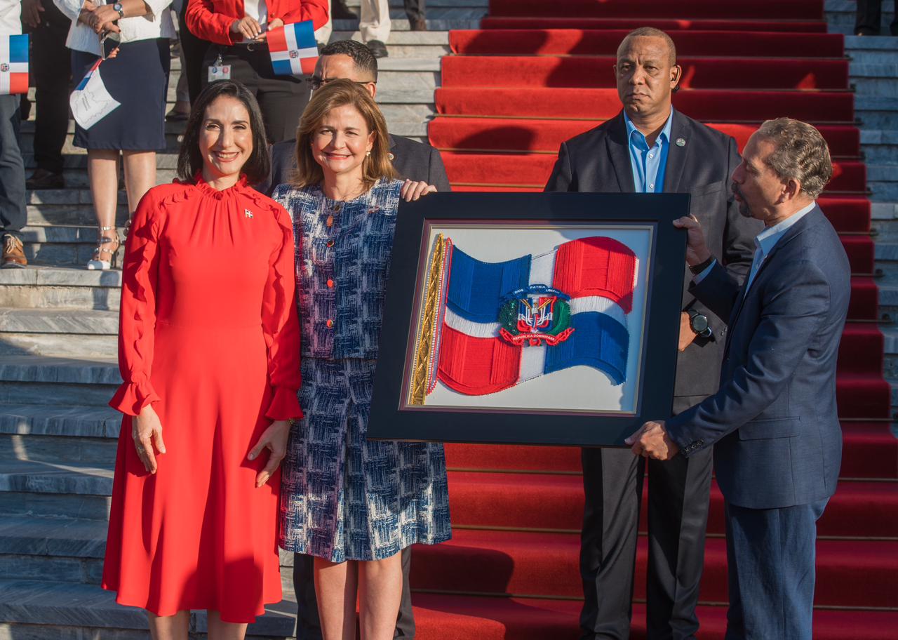 Posteriormente, Uribe hizo entrega a la vicepresidenta Raquel Peña, la Bandera Nacional y el Escudo Nacional en arte hilográfico.