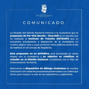 COMUNICADO Santo Domingo DN,>La Alcaldía del Distrito Nacional informa a la ciudadanía que la propuesta de Par Vial Lincoln -...