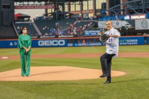 New York.- El presidente Luis Abinader hizo el lanzamiento de la primera bola en el partido del domingo en donde...