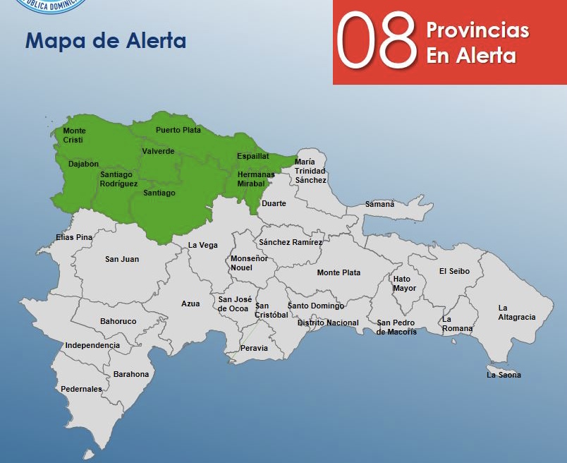Las provincias en alerta por posibles crecidas de ríos, arroyos y cañadas, así como inundaciones urbanas y repentinas, son Espaillat, Santiago Rodríguez, Hermanas Mirabal, Santiago, Valverde, Monte Cristi, Dajabón y Puerto Plata, siendo estas tres últimas las que tienen mayor probabilidad de lluvia.