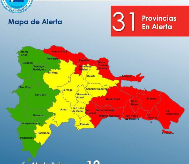 Las provincias en alerta roja son, San Cristóbal, Gran Santo Domingo, San Pedro de Macorís, La Romana, La Altagracia, María Trinidad Sánchez, Espaillat, Puerto Plata, Samaná, Hato Mayor, El Seibo, Monte Plata.