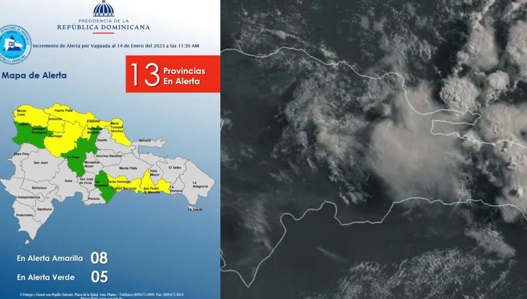 Santo Domingo RD,>El Centro de Operaciones de Emergencia (COE) incrementó este sábado a 13 provincias en alerta verde y amarilla debido a una vaguada que seguirá provocando aguaceros en territorio dominicano.