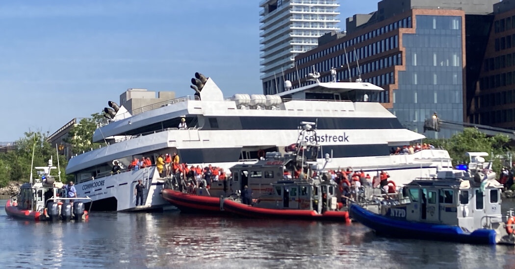 Nueva York,>Un ferry de Seastreak con 125 personas a bordo, 118 pasajeros y 7 miembros de la tripulación, encalló el sábado por la tarde en el borde de Brooklyn, lo que provocó una respuesta de rescate conjunta de la Policía de la Ciudad de Nueva York, el Departamento de Bomberos y de la Guardia Costera de los EE. UU.