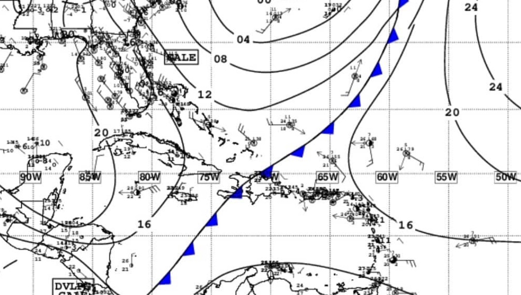 Para el jueves, se espera que tanto el sistema frontal como la vaguada se estén alejando de nuestra área de pronóstico, por consiguiente, se espera una reducción de las lluvias tanto en intensidad como en su frecuencia, no obstante, una débil vaguada en superficie y el viento del este/noreste continuarán favoreciendo la ocurrencia de chubascos dispersos sobre las regiones: norte, noreste, sureste y la Cordillera Central.